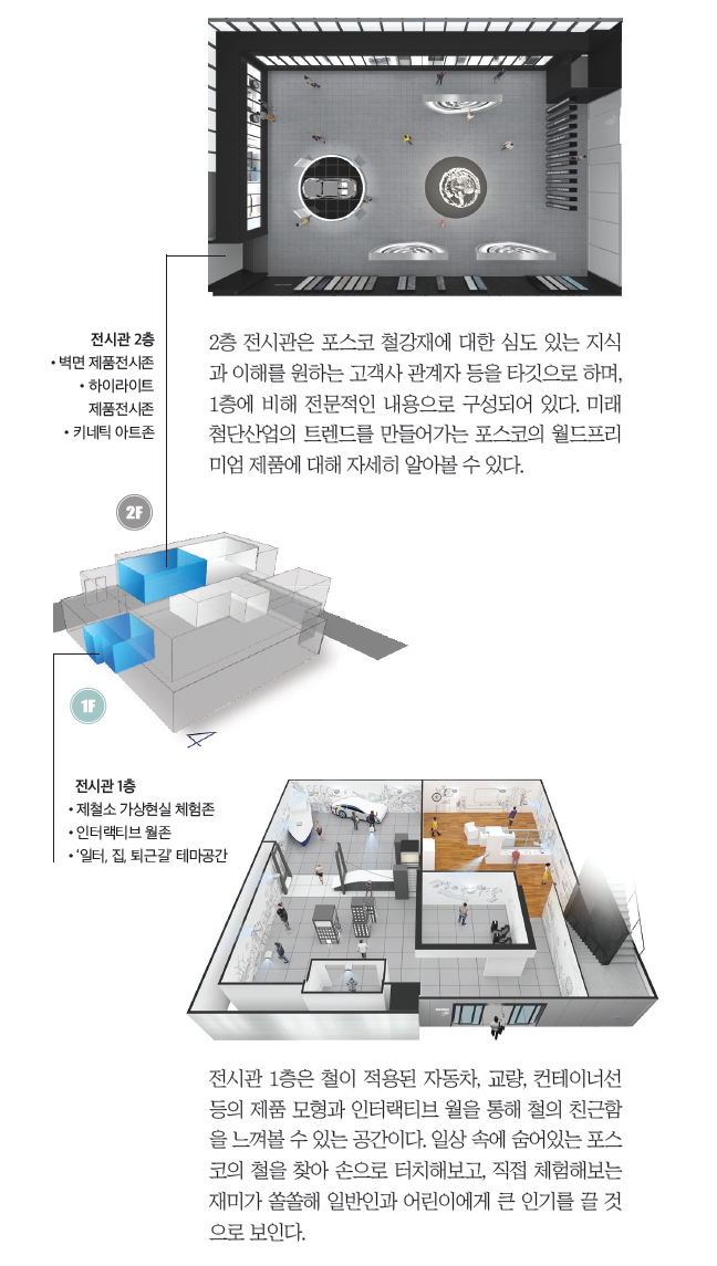 ÃÖ±Ù ÀαâÀÎ VR(Virtual Reality¡¤°¡»óÇö½Ç) üÇèÁ¸ÀÌ ±¸ºñµÇ¾î ÀÖ¾î ´«±æÀ» ²ö´Ù. ¼¼ °³ÀÇ Áøµ¿ÀÇÀÚ°¡ ¸¶·ÃµÇ¾î Àִµ¥, Çìµå¼ÂÀ» Âø¿ëÇϰí À̰÷¿¡ ¾ÉÀ¸¸é Á¦Ã¶¼Ò Àü°æ°ú ±â°¡½ºÆ¿ ±â¼ú¿¡ ´ëÇÑ ¼³¸íÀÌ ÆÄ³ë¶ó¸¶Ã³·³ ÆîÃÄÁø´Ù. »ýȰ ¼ÓÀÇ Ã¶°ú °í°´»çÀÇ Á¦Ç°À» Ä£±ÙÇÏ°Ô Á¢ÇÒ ¼ö ÀÖ´Â 1Ãþ Àü½Ã°üÀÇ º®¸éÀº ÀÎÅÍ·¢Æ¼ºê ¿ù(interactive wall)·Î ±¸¼ºµÇ¾î ÀÖ´Ù. ÀÎÅÍ·¢Æ¼ºê ¿ùÀ̶õ º®¸éÀÇ À̹ÌÁö¸¦ ¼ÕÀ¸·Î ÅÍÄ¡ÇØ ¿òÁ÷ÀÌ°Ô ÇÏ´Â ÃÖ÷´Ü üÇè½Ã¼³À» ¸»ÇÑ´Ù. Àü½Ã°ü ³»ºÎ º®¸éÀº »ç¹«½Ç, °¡Á¤, °íÃþºôµù, ÄÁÅ×À̳ʼ± µî Àϻ󿡼 Á¢ÇÒ¼ö ÀÖ´Â ´Ù¾çÇÑ È¯°æÀ» ¹¦»çÇÑ ±×¸²À¸·Î ä¿öÁ® ÀÖ´Ù.